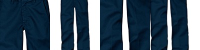 65% polyester, 35% cotton twill; Easy care stain-release; wrinkle- and fade-resistant; Reinforced knees; Two back welt pockets - left with button closure; No exterior logo;